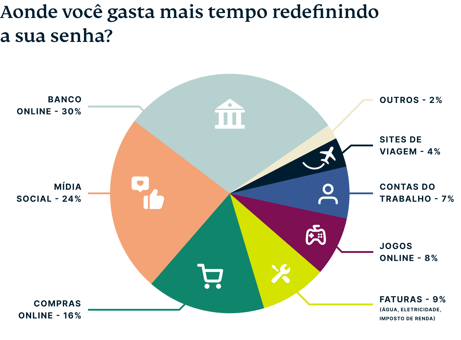 Para uma grande parte dos entrevistados dos quatro países, esta situação é muito comum. Cerca de 30% citam o banco online como o tipo de site ou aplicativo para o qual é mais provável que eles esqueçam suas senhas de login, mais do que redes sociais (24%), compras online (16%), sites e aplicativos de serviços públicos (9%) e jogos online (8%).