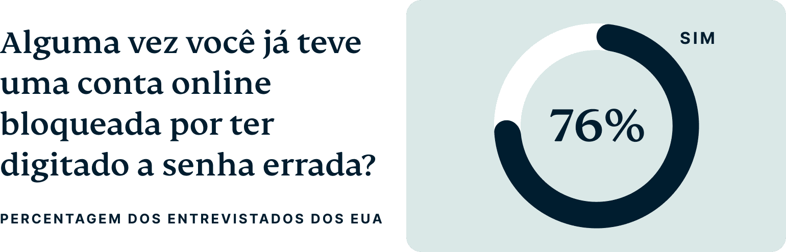 Mais de 76% dos entrevistados dos EUA revelam que foram bloqueados de suas contas depois de inserir uma senha incorretamente. Isso pode significar coisas diferentes, dependendo da conta: esperar um tempo antes de poder tentar novamente; ser forçado a redefinir a senha; ter que entrar em contato com a empresa por outros métodos, como telefone ou email.