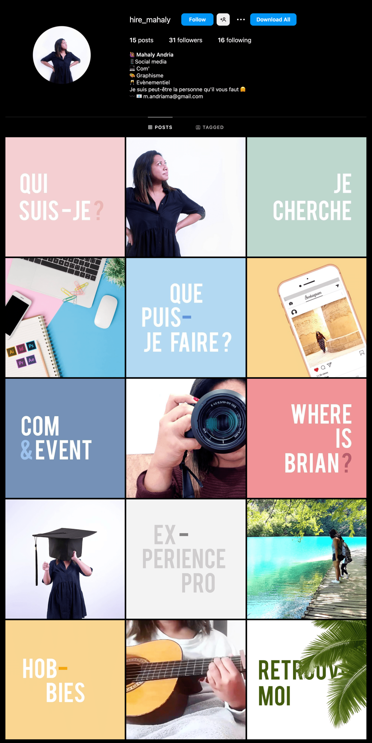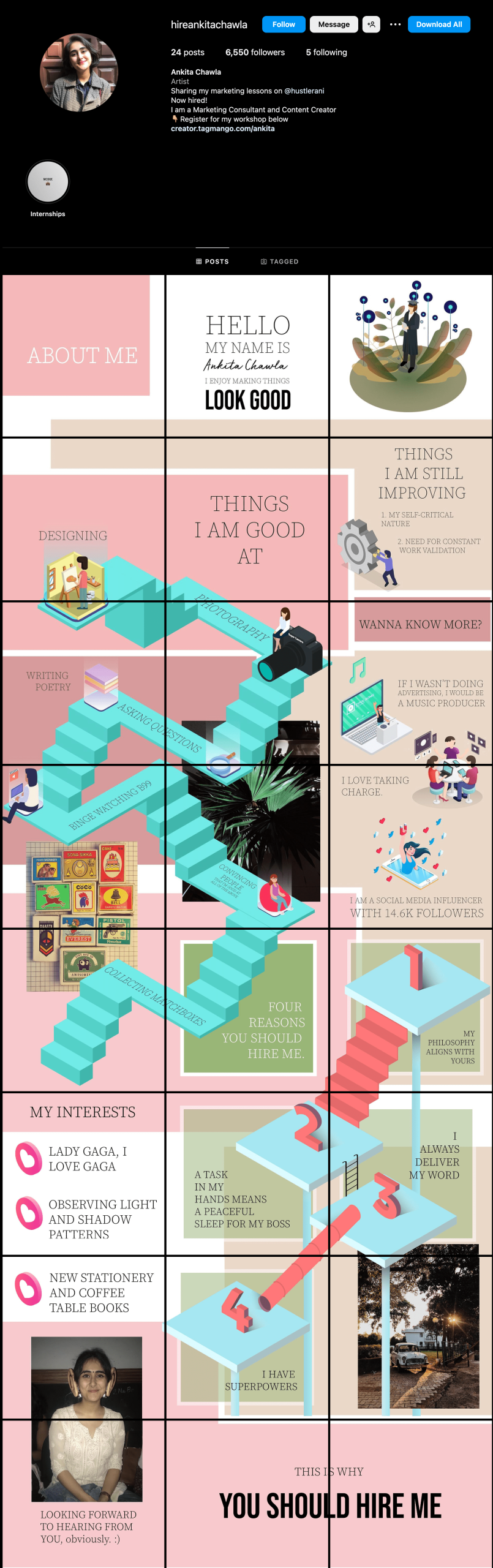 Till exempel omvandlade Ankita Chawla, en användare i Indien, sitt personliga Instagram-konto till en kreativ monter för sina talanger och färdigheter. Hon designade sitt CV som ett collage och publicerade det på sin profil, vilket ledde till jobbet som visuell kreatör på Deloitte Indien.