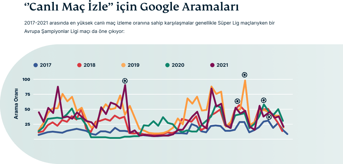 Geçtiğimiz beş yıla dönüp baktığımızda 2019 yılının en çok ve 2017 yılının en az canlı maç izleme aramasına sahip yıl olduğunu görüyoruz. Her yıl en çok canlı maç izleme aramasına sahip günler grafikte futbol topu ikonu ile işaretlenmiştir ve bir futbol maçını temsil etmektedir.